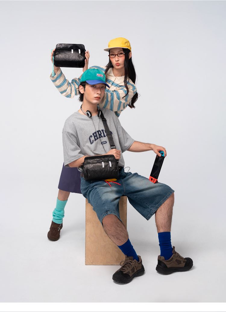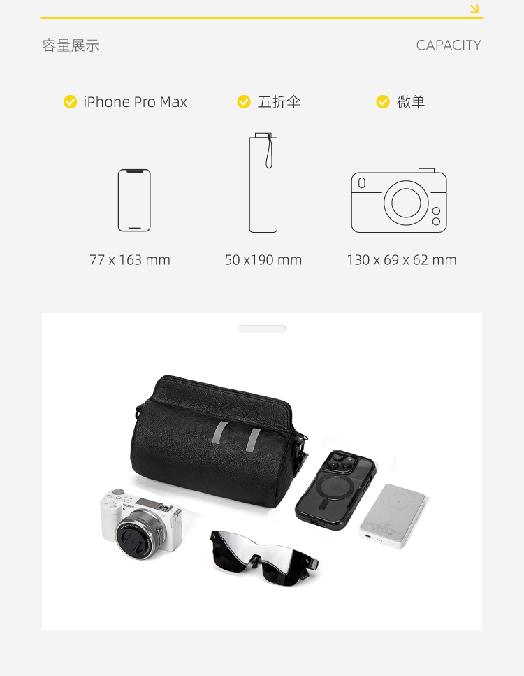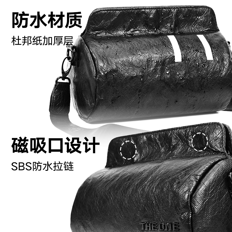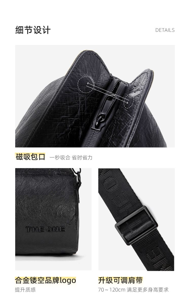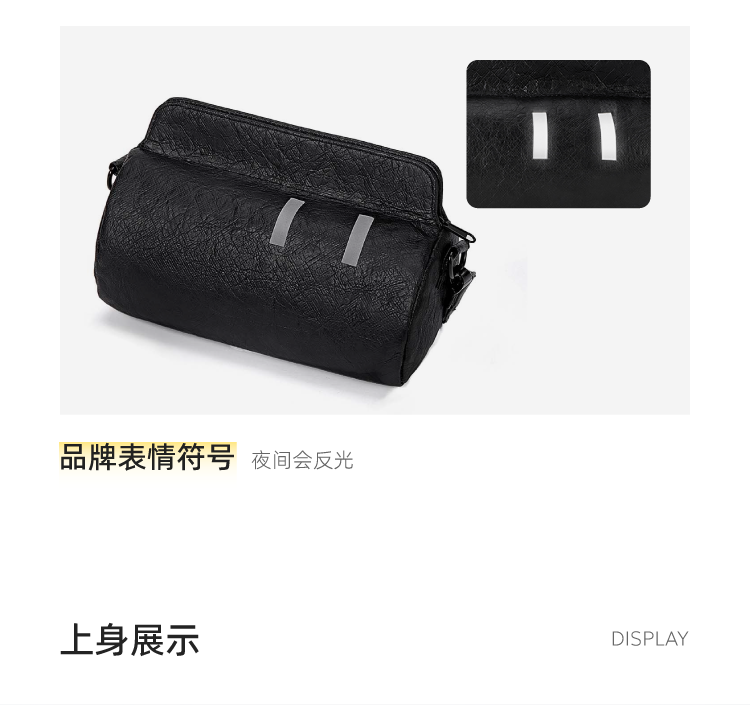 材质:杜邦纸+绒布 容量:2.6L 颜色:黑色 尺寸: 23x15x12cm 重量:225g 卖点: ①磁吸包口,一秒贴合,快拿快取 ②2.6l的超大容量,满足日常出行 ③不易夹发的肩带设计,可调节肩带调节70-120mm ④logo镂空黑金质感大升级 ⑤表情符号夜间反光,满足安全出行 ⑥全包防泼溅,雨天出行无忧