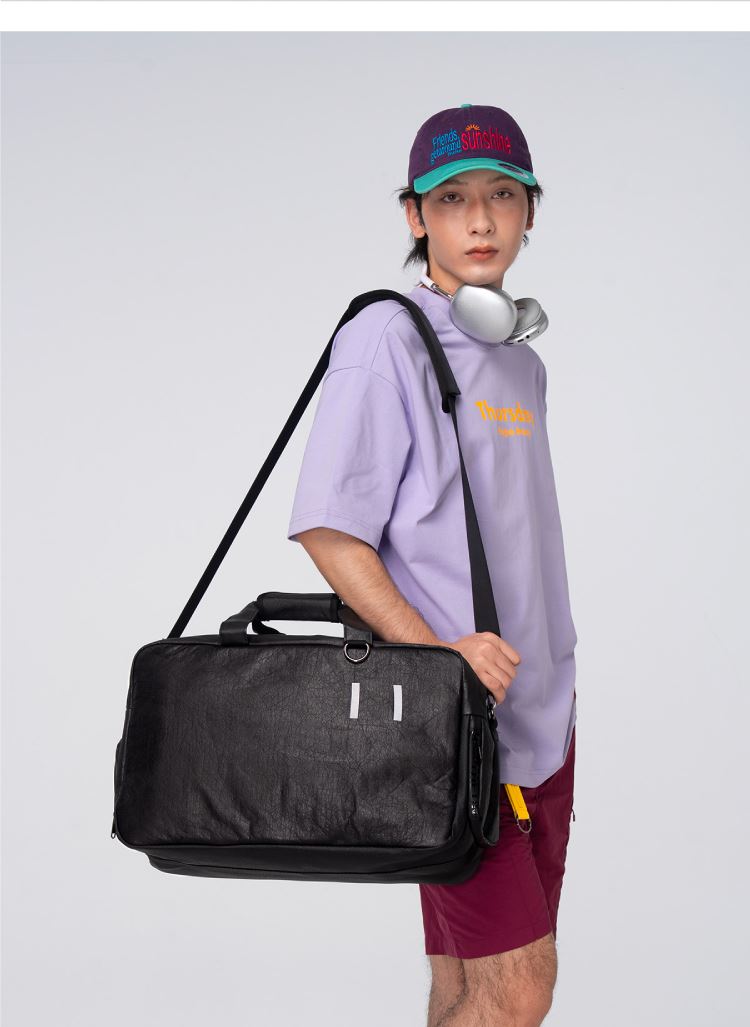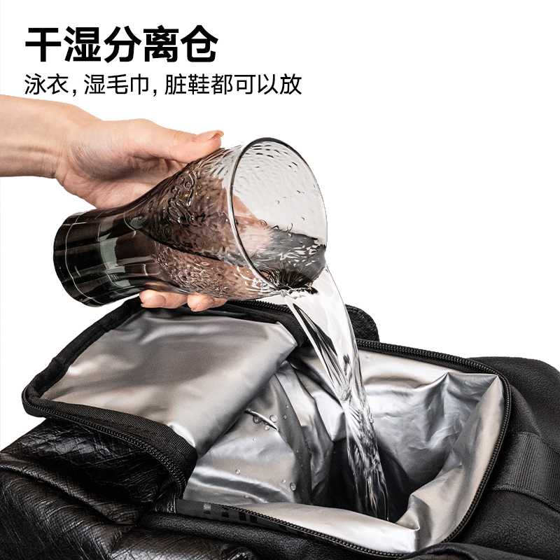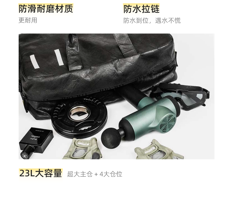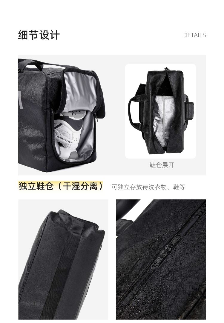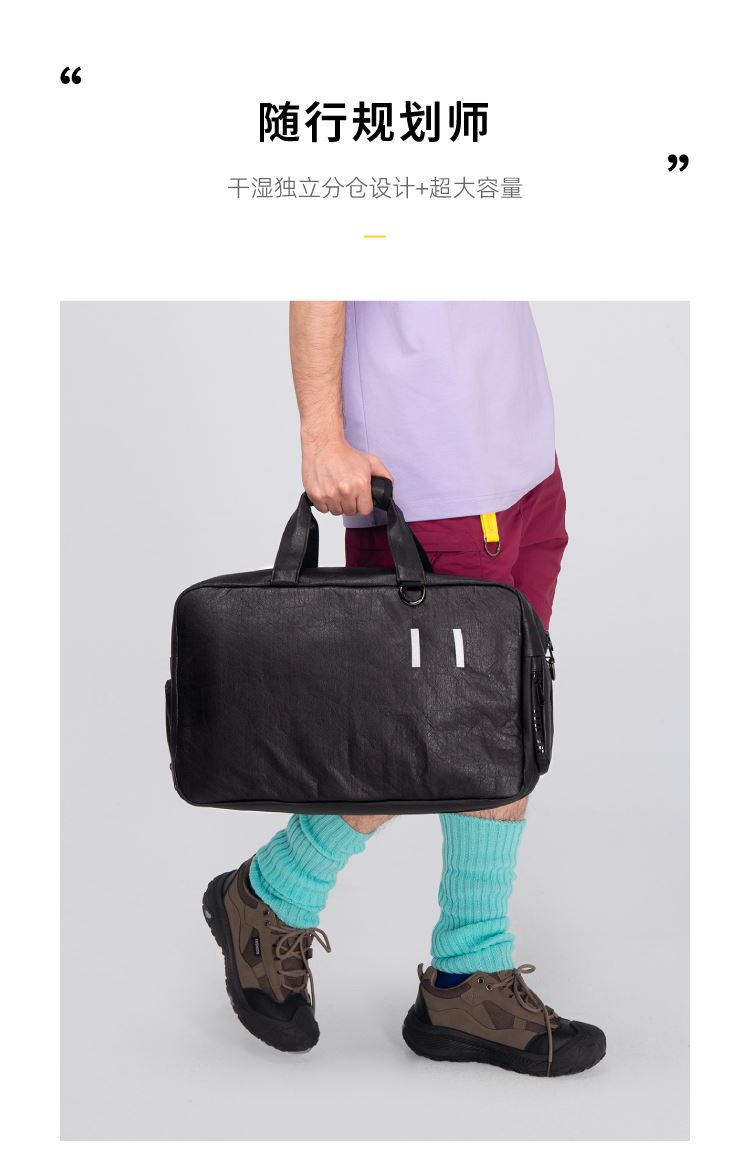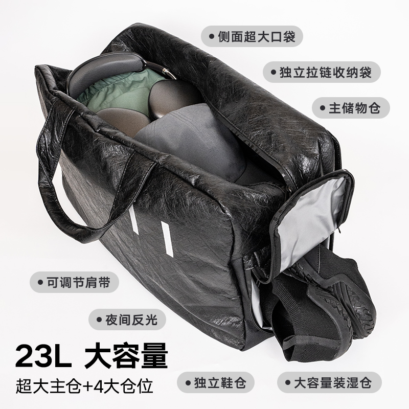 材质:杜邦纸+绒布 容量:23L 颜色:黑色 尺寸:47x18x26cm 重量:730g 卖点: ①23L大容量,超大主仓+4大仓位 ②干湿分离仓,采用防潮面料,可独立存放待洗衣物、鞋等 ③底部采用,采用防滑耐磨面料,更耐用 ④磁吸包口,一秒贴合,省时省力 ⑤加厚防水拉链,升级更防水,顺滑方便拿取 ⑥DIY挂扣区,可以随意放置任何挂件 ⑦减负提手和肩带,提重物出行增大受力面积 ⑧表情符号夜间反光,满足安全出行 ⑨金属logo,专属定制金属色