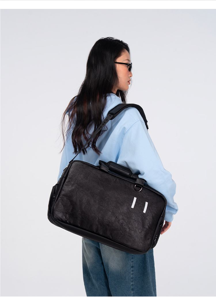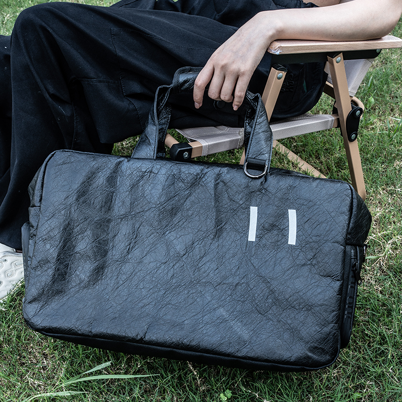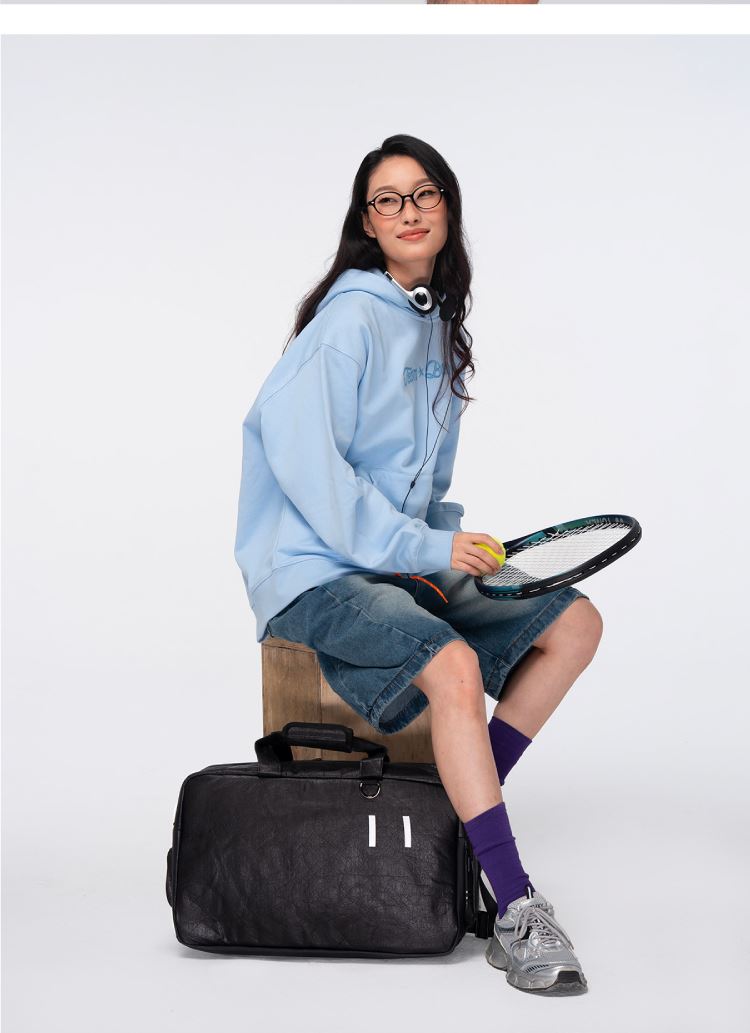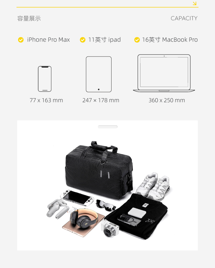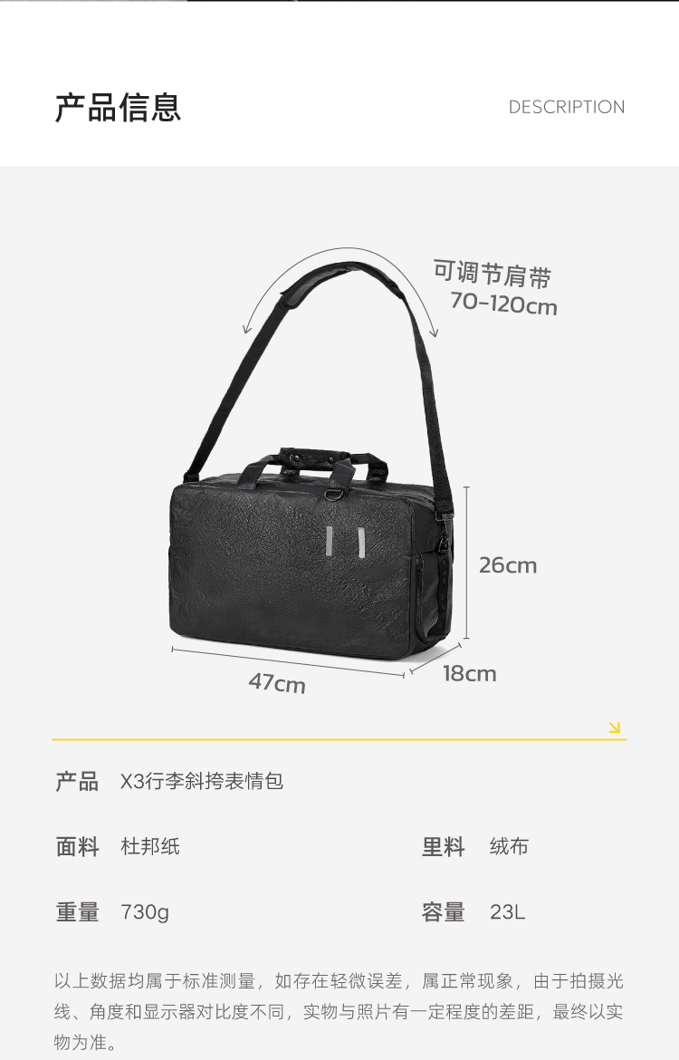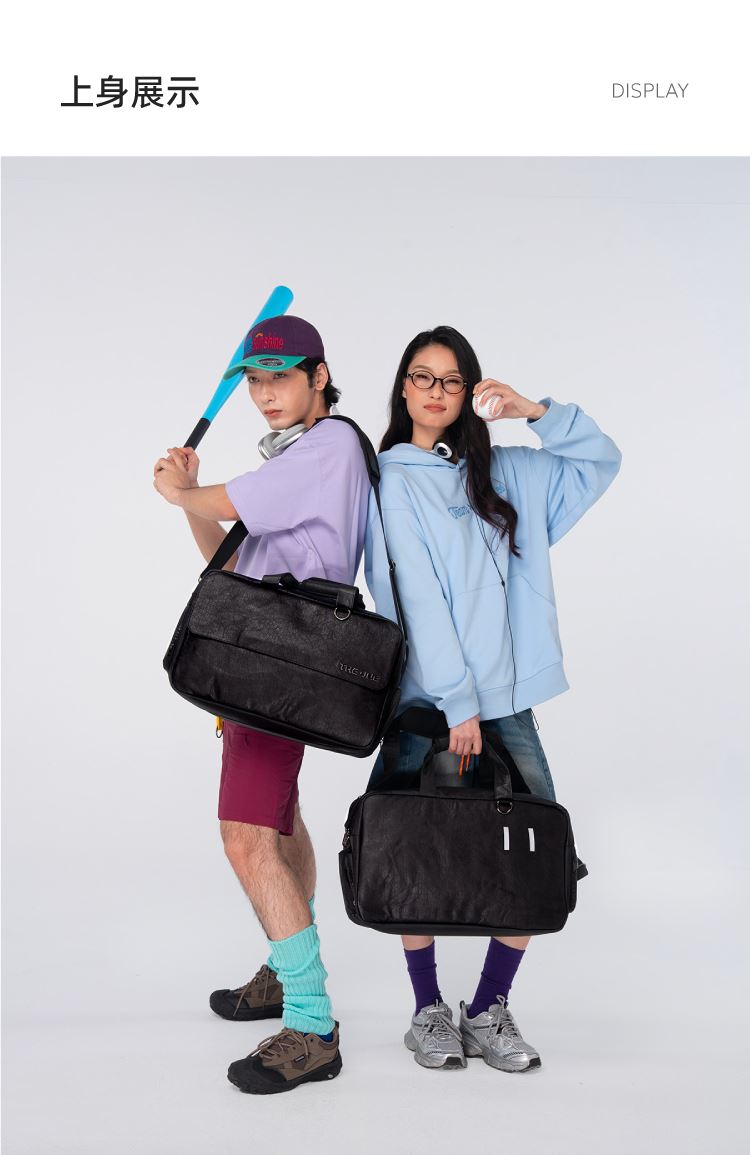 材质:杜邦纸+绒布 容量:23L 颜色:黑色 尺寸:47x18x26cm 重量:730g 卖点: ①23L大容量,超大主仓+4大仓位 ②干湿分离仓,采用防潮面料,可独立存放待洗衣物、鞋等 ③底部采用,采用防滑耐磨面料,更耐用 ④磁吸包口,一秒贴合,省时省力 ⑤加厚防水拉链,升级更防水,顺滑方便拿取 ⑥DIY挂扣区,可以随意放置任何挂件 ⑦减负提手和肩带,提重物出行增大受力面积 ⑧表情符号夜间反光,满足安全出行 ⑨金属logo,专属定制金属色