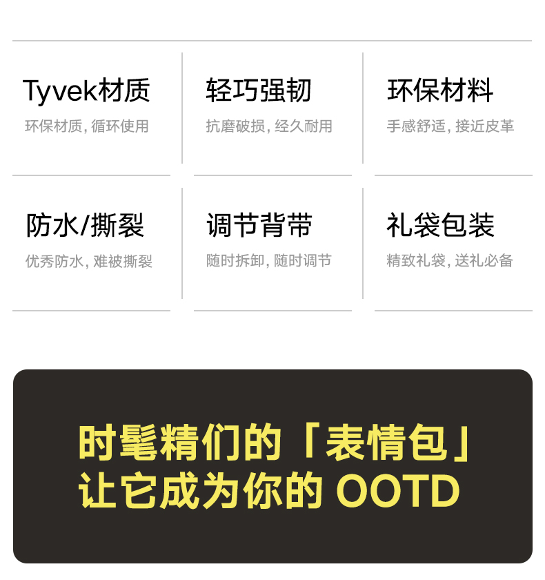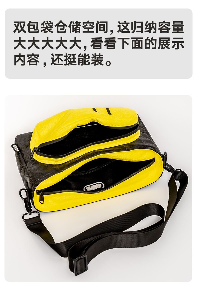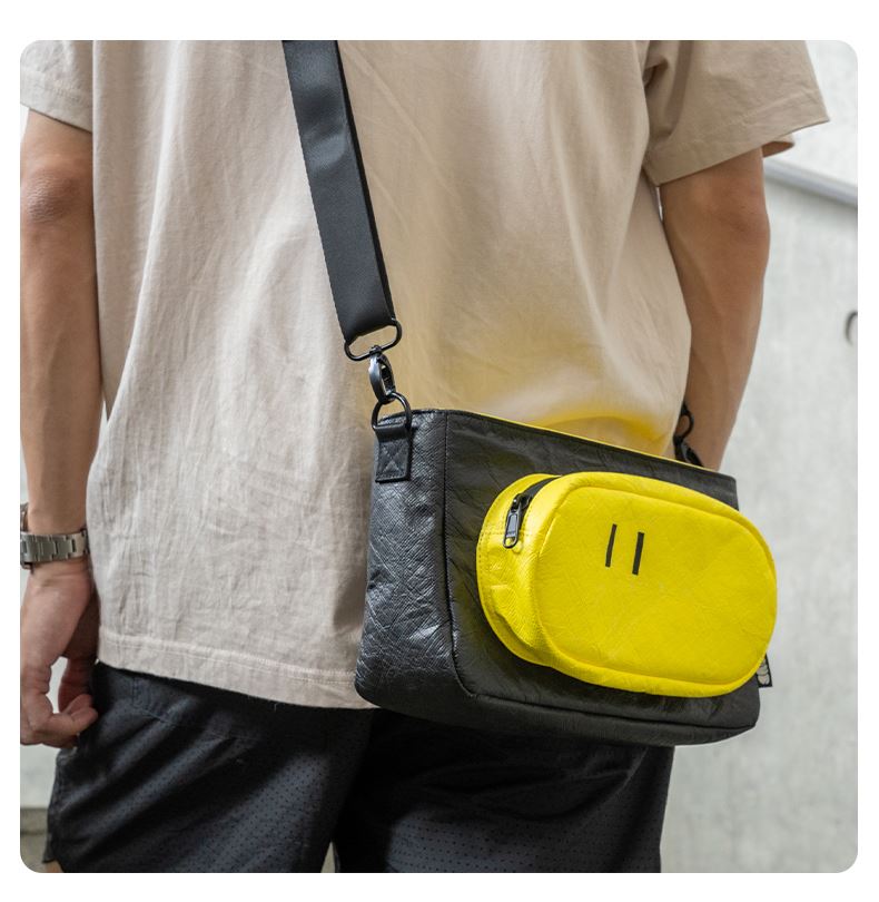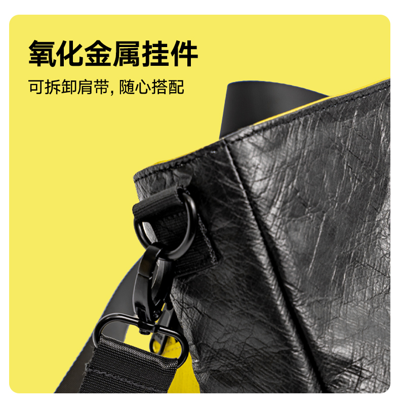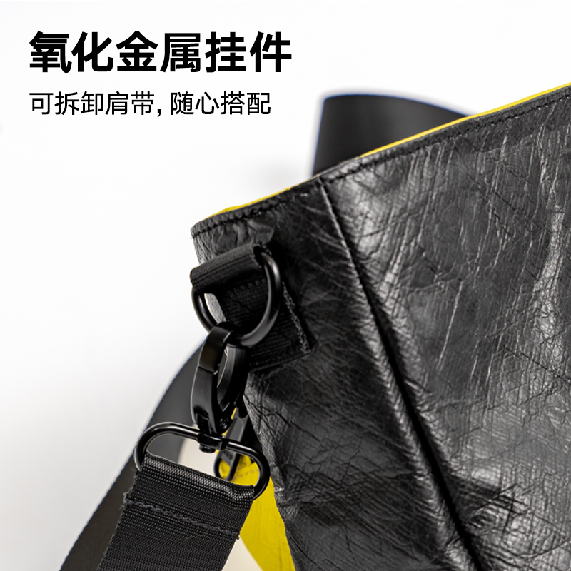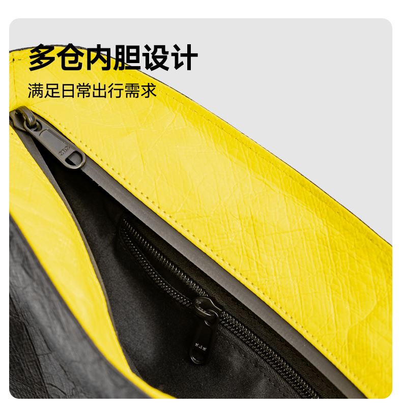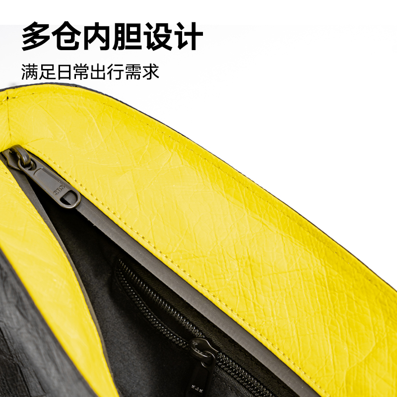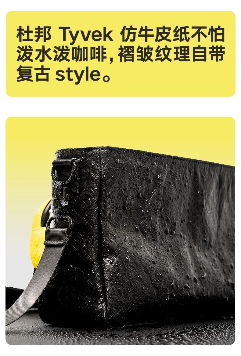 材质:杜邦纸+绒布 容量:4.3L 颜色:黑黄色 尺寸:27*12*16cm 重量:248g 卖点: ①包身撞色设计,为出行穿搭增添了多巴胺活力感 ②TYVKE荷叶式防水,雨再大也不怕了,再小的水珠也无缝可钻,风雨进不来,汽能出得去 ③四层防护,绒布的里布保护安全,手机相机ipad轻量出行的同时也不马虎一秒吸合,省时省力 ④可拆卸的肩带,灵活的设计方便,你做各种穿搭,包身和肩带可以拆卸 ⑤三个拉链口袋仓,包内有分仓拿加宽的肩带条背起来舒舒服服小物不用把包翻个底朝天 ⑥细节感十足,内层隔袋,可放小物品、烤漆五金扣、水洗唛标、烤漆金属件