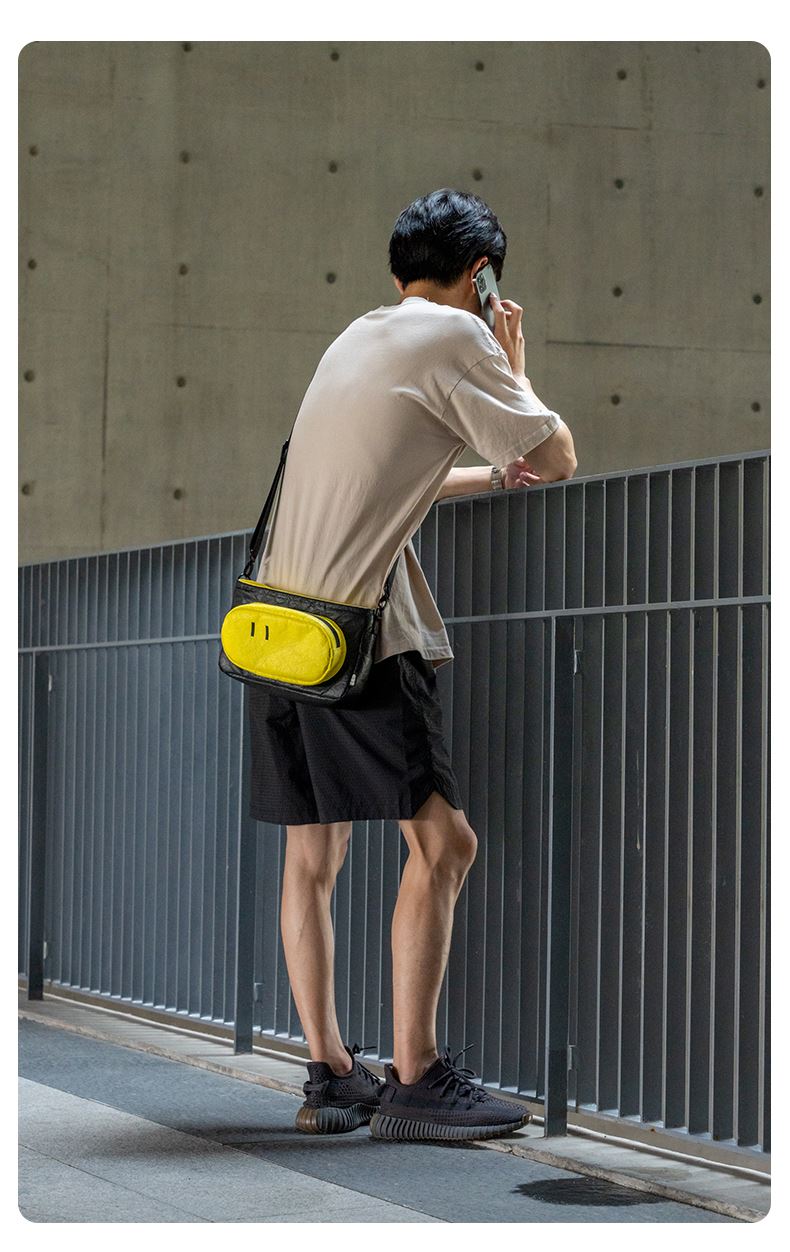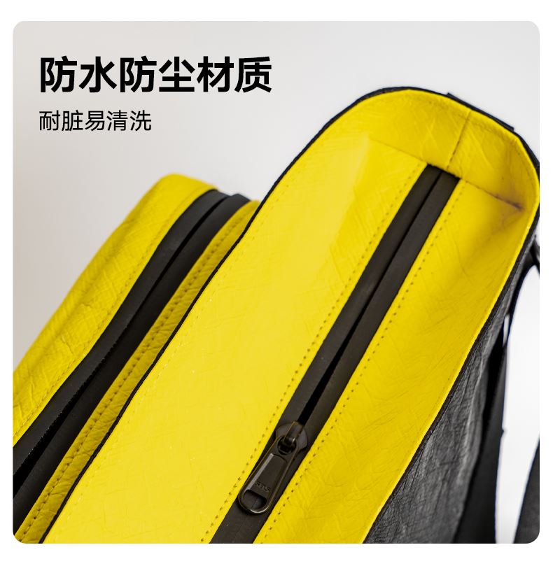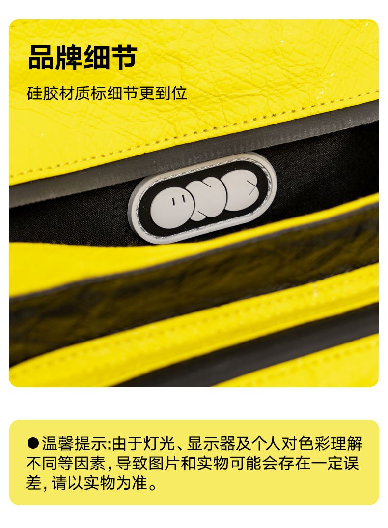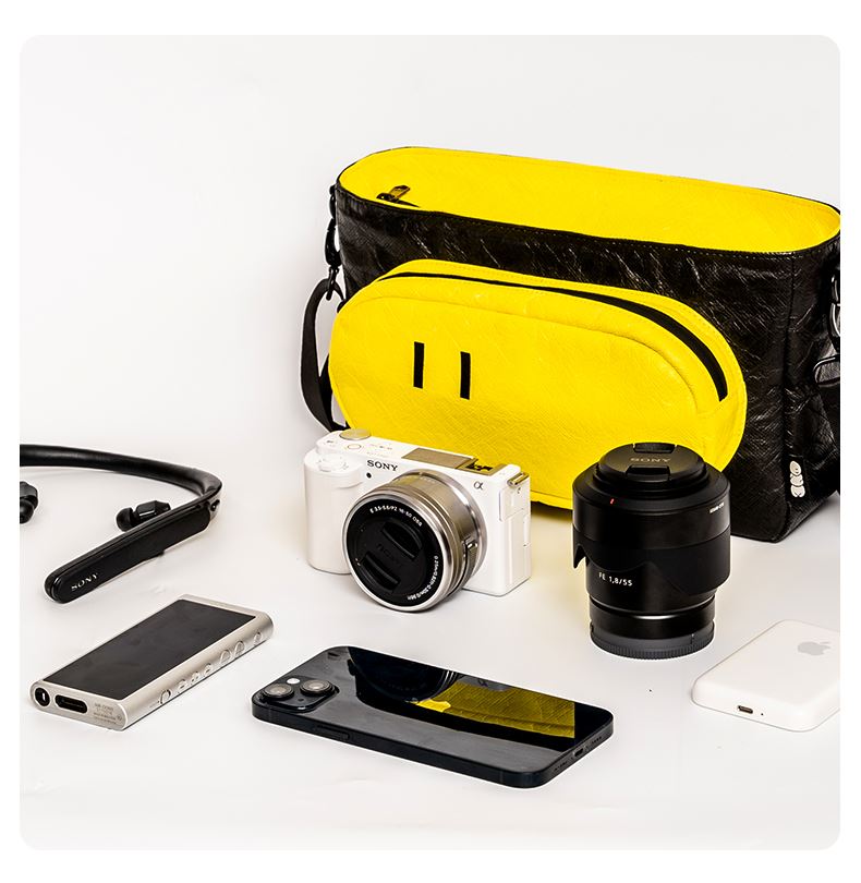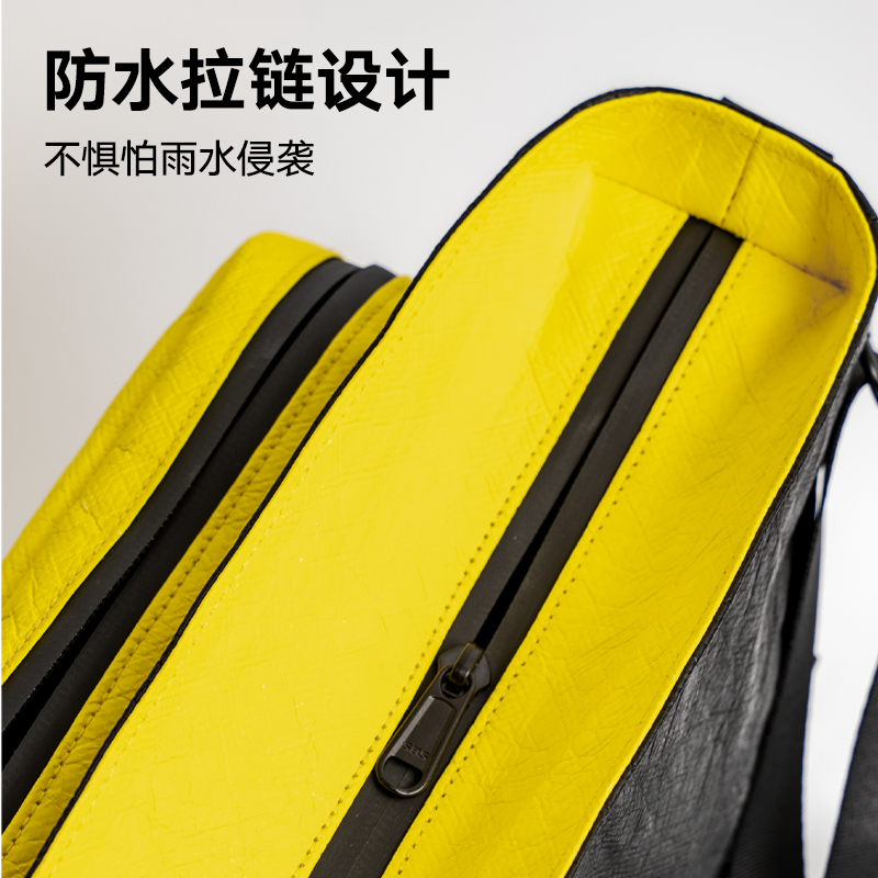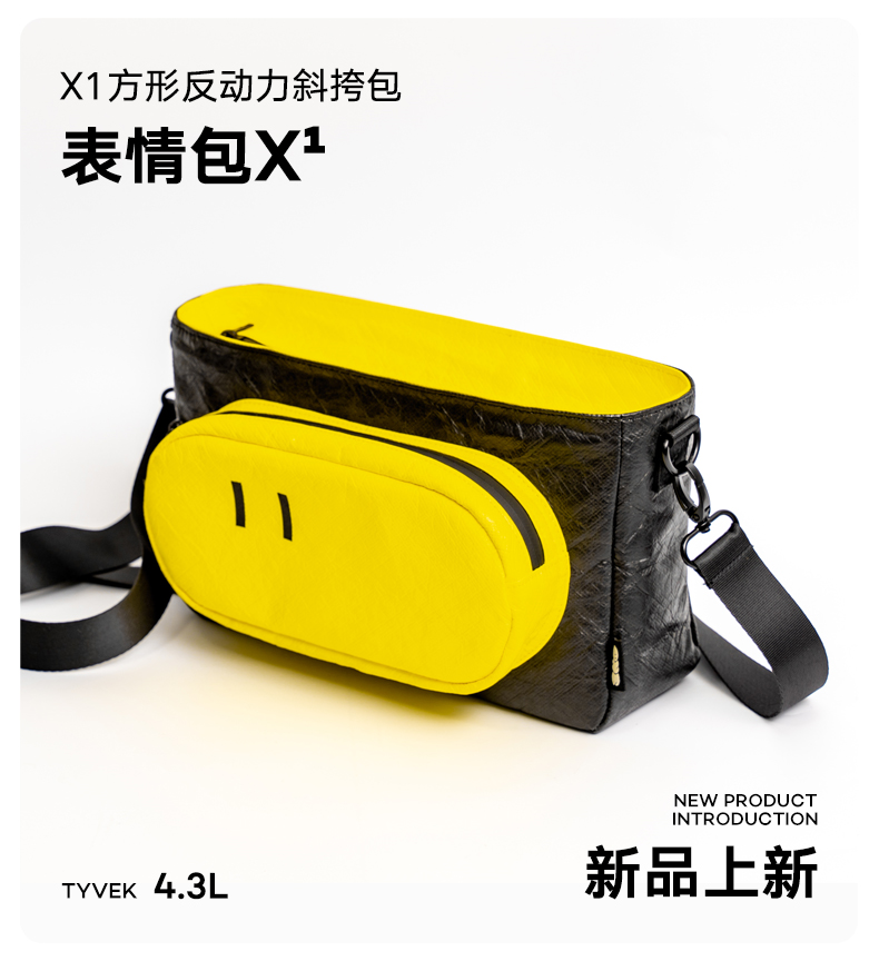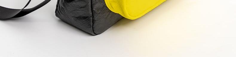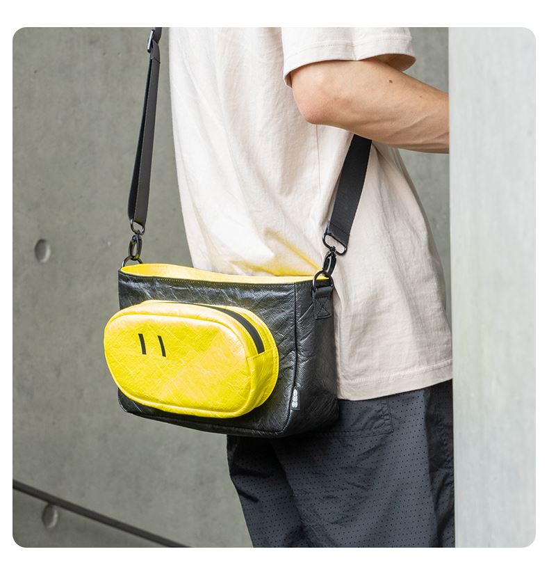 材质:杜邦纸+绒布 容量:4.3L 颜色:黑黄色 尺寸:27*12*16cm 重量:248g 卖点: ①包身撞色设计,为出行穿搭增添了多巴胺活力感 ②TYVKE荷叶式防水,雨再大也不怕了,再小的水珠也无缝可钻,风雨进不来,汽能出得去 ③四层防护,绒布的里布保护安全,手机相机ipad轻量出行的同时也不马虎一秒吸合,省时省力 ④可拆卸的肩带,灵活的设计方便,你做各种穿搭,包身和肩带可以拆卸 ⑤三个拉链口袋仓,包内有分仓拿加宽的肩带条背起来舒舒服服小物不用把包翻个底朝天 ⑥细节感十足,内层隔袋,可放小物品、烤漆五金扣、水洗唛标、烤漆金属件