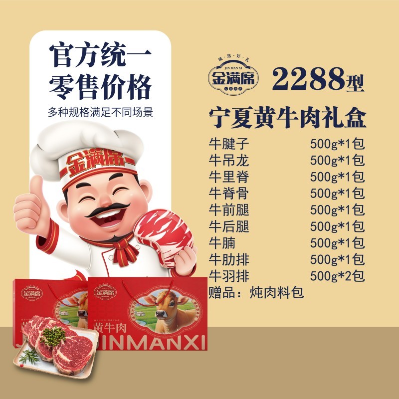 1.宁夏黄牛腱子500g 2.宁夏黄牛吊龙500g 3.宁夏黄牛里脊500g 4.宁夏黄牛脊骨500g 5.宁夏黄牛前腿500g 6.宁夏黄牛后腿500g 7.宁夏黄牛腩500g 8.宁夏黄牛肋排500g 9.宁夏黄牛羽排1000g 赠品:炖肉料包