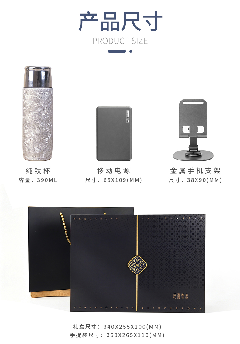 产品规格: 1.觅芳境--纯钛杯 容量:390ML 2.睿量--薄卡PRO20W数显金属磁吸无线快充移动电源10000MAH/5000MAH体积轻薄,铝合金材质,握感好,大容量,超长续航,随身携带无压力超强吸附,一贴就充电,LED数显,电量一看便知 TYPE-C双向快充,无线快充15W,TYPE-C支持苹果15快充20W聚合物优质电芯,安全充电不伤机 3.手机支架 720°旋转全金属折叠支架 硬核碳素钢稳固磐石 加厚转盘转动支撑更有力