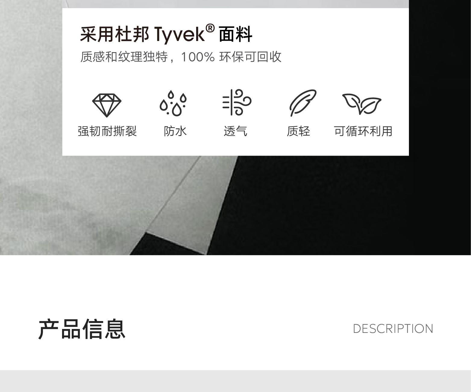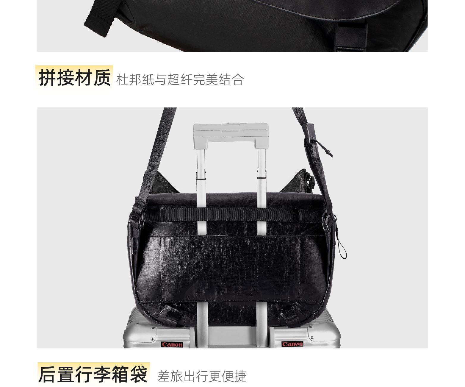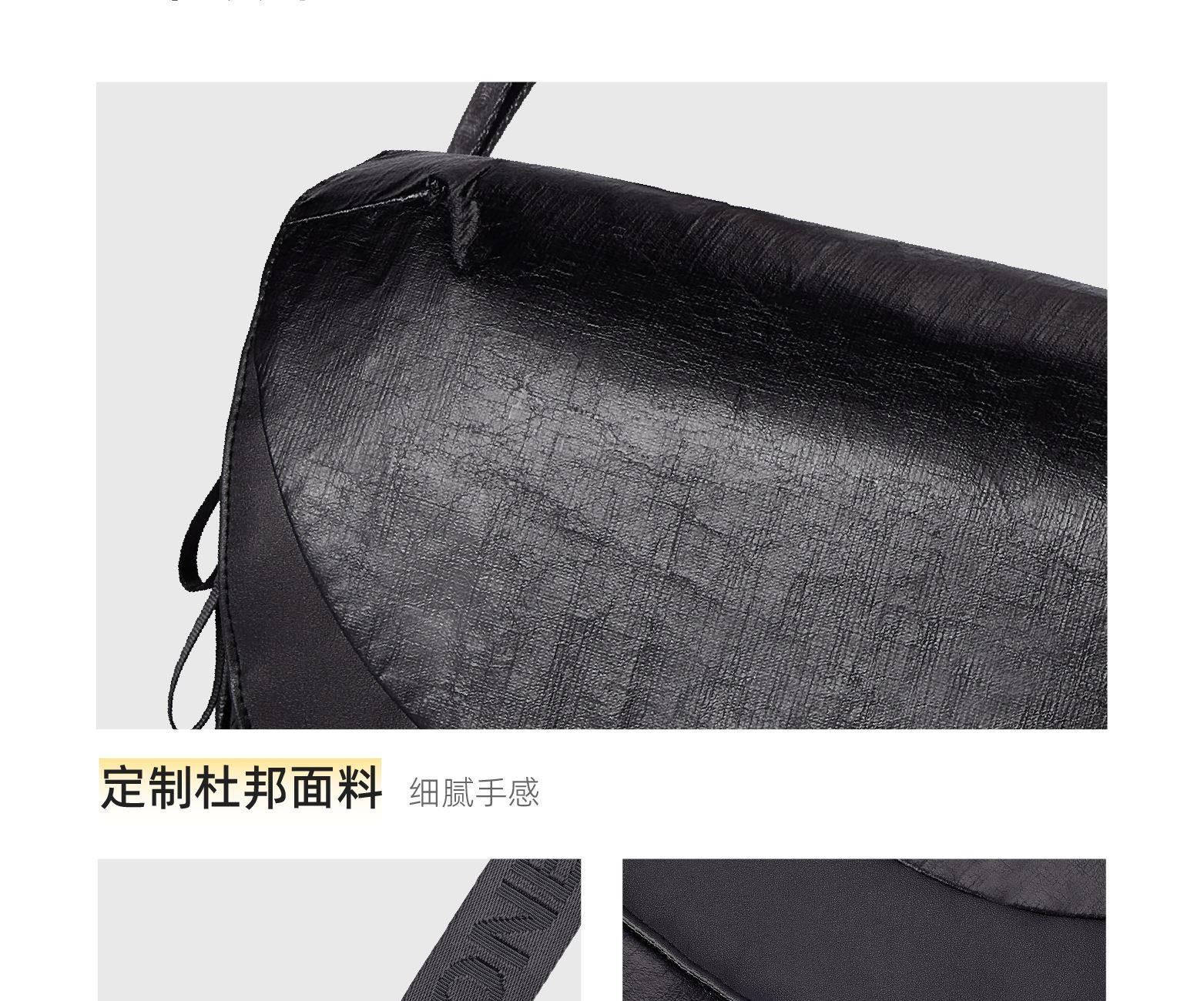 材质;杜邦纸+绒布+超纤皮 容量:9L 颜色:黑色 尺寸:38x10x28cm 重量:650g 卖点: ①双面肩带单手快速调节肩带长短 ②杜邦纸和超纤料拼接,材质的碰撞打造出不一样的质感 ③独特软面杜邦,做旧质感上身更休闲 ④加宽的肩带条,缓解上肩时的压力和勒感,背起来更舒服 ⑤独立加厚电脑仓和ipad仓,可容纳14寸电脑,保护您的电子设备 ⑥后置行李箱带,出行更轻松 ⑦丝印logo低调又有个性 ⑧底部可调节宽度,包型厚度由你掌控 ⑨包包连接处多层加固车缝线,包内升级格子里布