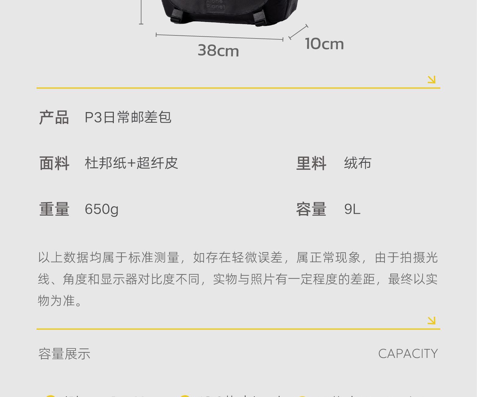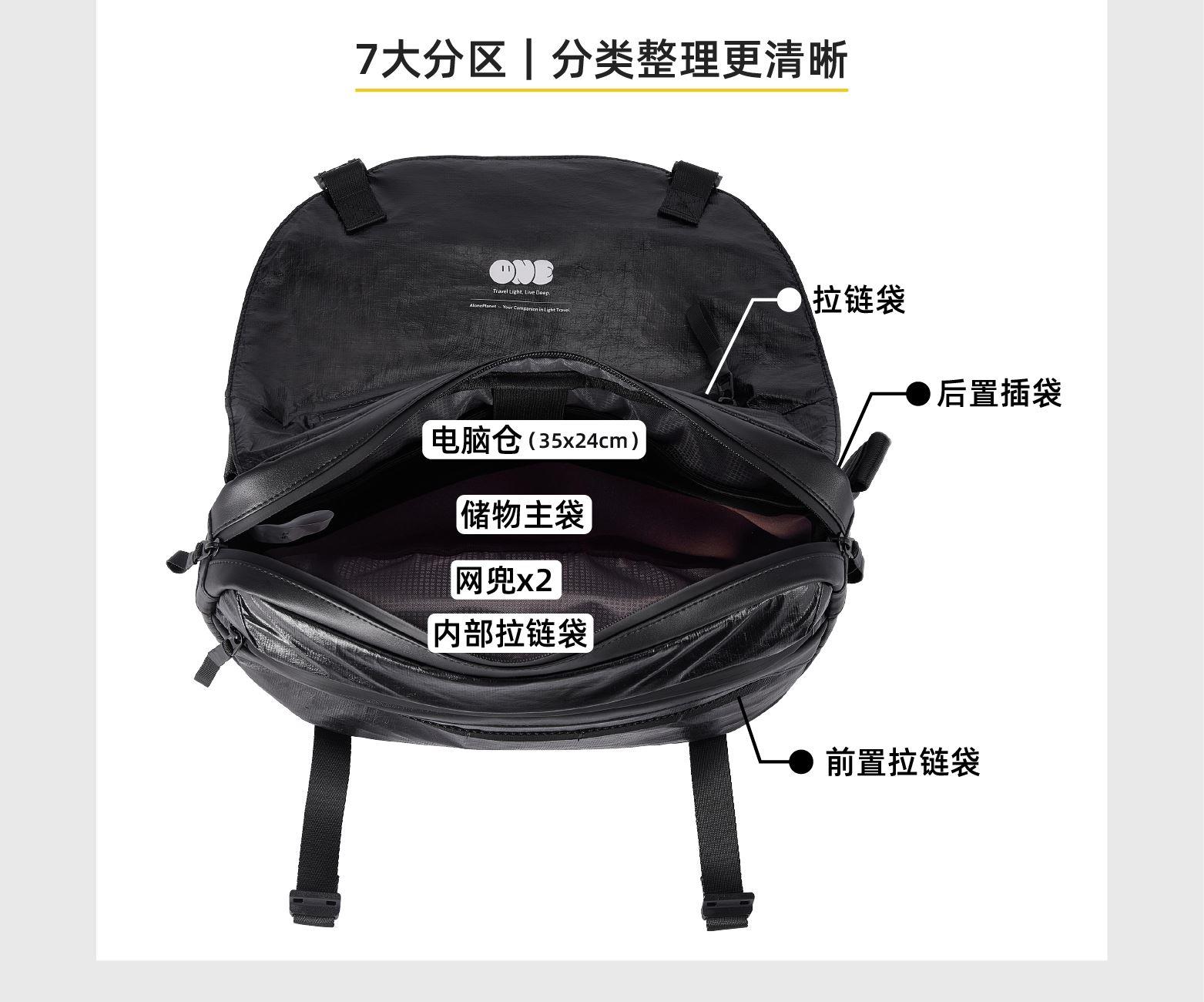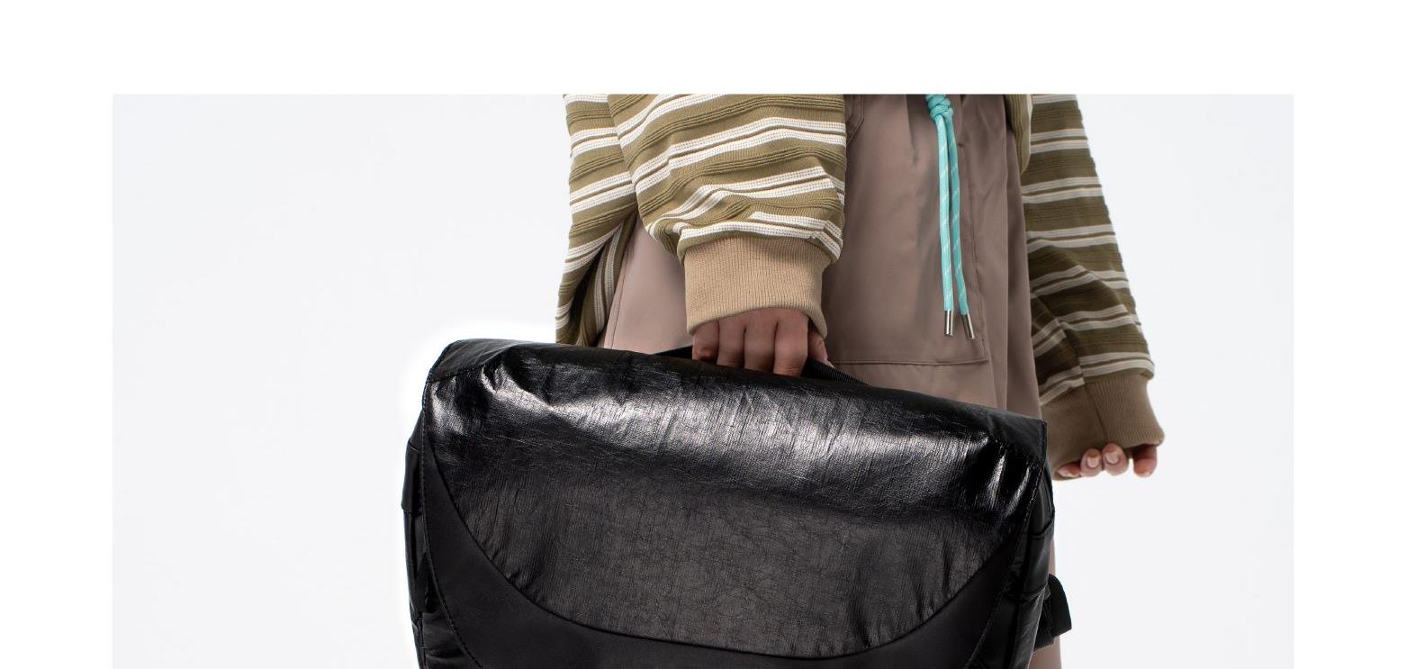 材质;杜邦纸+绒布+超纤皮 容量:9L 颜色:黑色 尺寸:38x10x28cm 重量:650g 卖点: ①双面肩带单手快速调节肩带长短 ②杜邦纸和超纤料拼接,材质的碰撞打造出不一样的质感 ③独特软面杜邦,做旧质感上身更休闲 ④加宽的肩带条,缓解上肩时的压力和勒感,背起来更舒服 ⑤独立加厚电脑仓和ipad仓,可容纳14寸电脑,保护您的电子设备 ⑥后置行李箱带,出行更轻松 ⑦丝印logo低调又有个性 ⑧底部可调节宽度,包型厚度由你掌控 ⑨包包连接处多层加固车缝线,包内升级格子里布