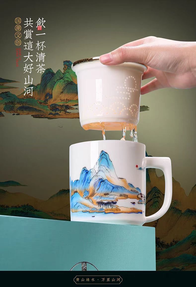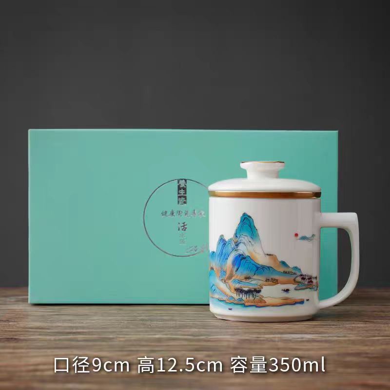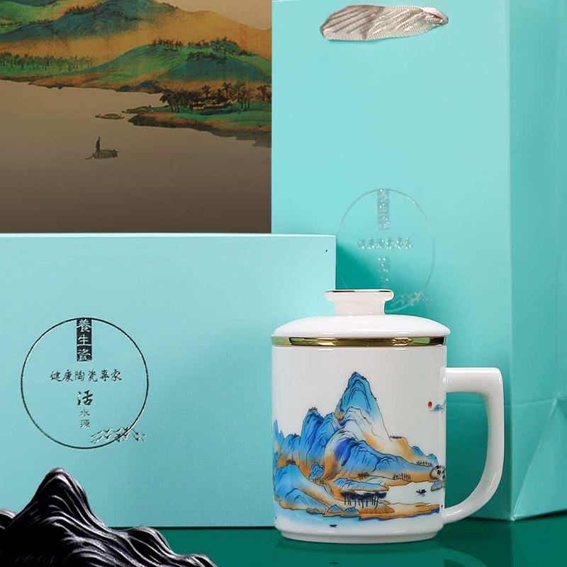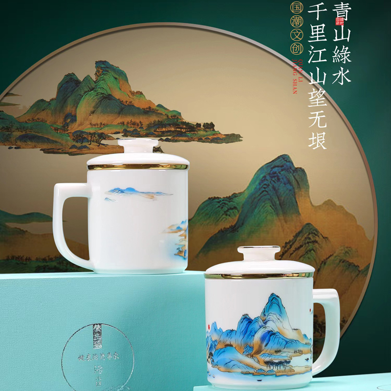 鹏翼商务文创羊脂玉瓷千里江山办公杯