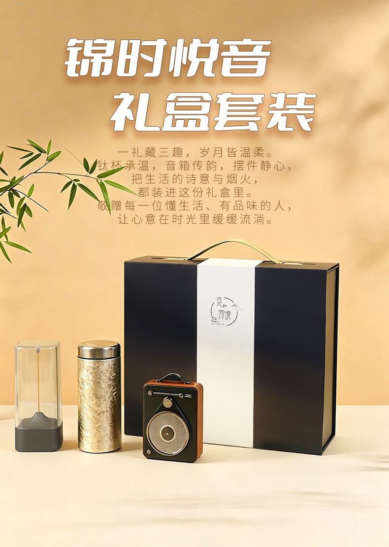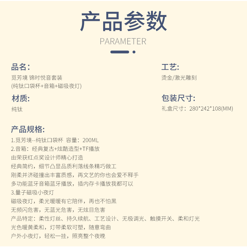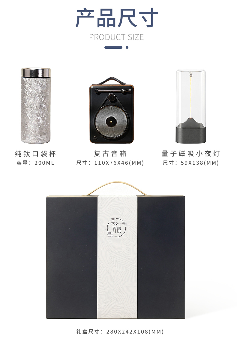 1.觅芳境--纯钛口袋杯容量:200ML 2.音箱:经典复古+炫酷造型+TF播放由荣获红点奖设计师精心打造 经典简约,细节凸显品质利落线条精巧做工刚柔并济碰撞出丰富质感,再文艺的你也会爱不释手多功能蓝牙音箱蓝牙播放,插内存卡播放我都可以 3.量子磁吸小夜灯 磁吸夜灯,柔光暖暖有它陪伴,再也不怕黑无频闪危害,无蓝光危害,无炫目危害产品特定:柔性灯丝、持久续航、工艺设计、无极调光、触摸开关、柔和灯光光色暖黄柔和,灯带柔软可塑,随意弯曲户外小夜灯,轻松一挂,照亮整个夜晚