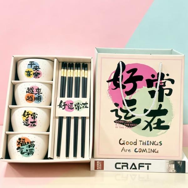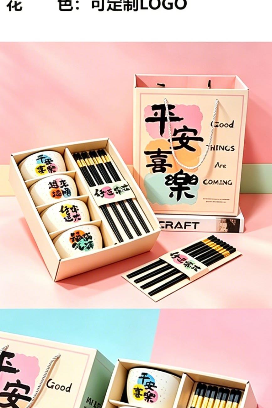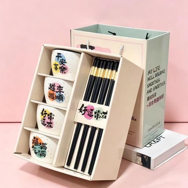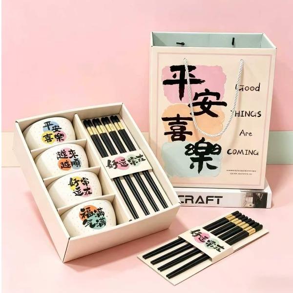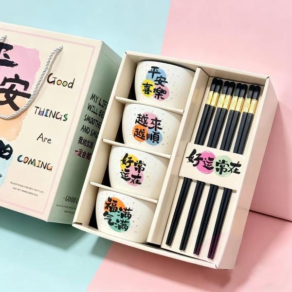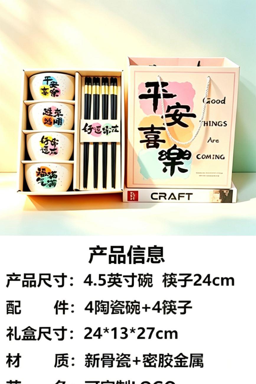 产品尺寸:4.5英寸碗 筷子24cm 材 质:新骨瓷+密胺金属筷 配 件:4个4.5寸碗+4双筷子 箱 规:62*45*55cm 26.6kg 彩盒:24*13*27cm 美好寓意:碗身自带祝福文案,吃饭都能收获好心情 实用配齐:4 碗 4 筷,满足日常用餐需求 送礼佳选:自带礼盒礼袋,乔迁 / 节日 / 伴手礼都适配 细节贴心:陶瓷碗易清洗,筷子防滑耐用
