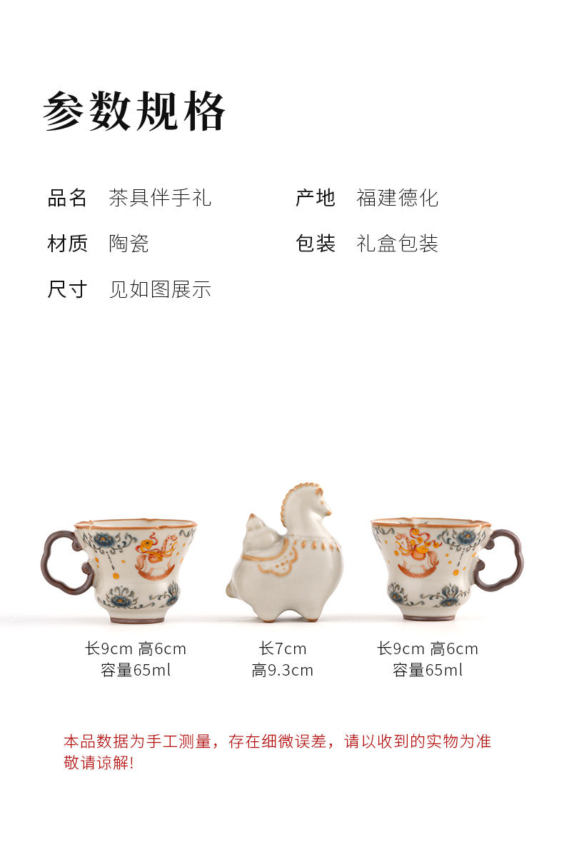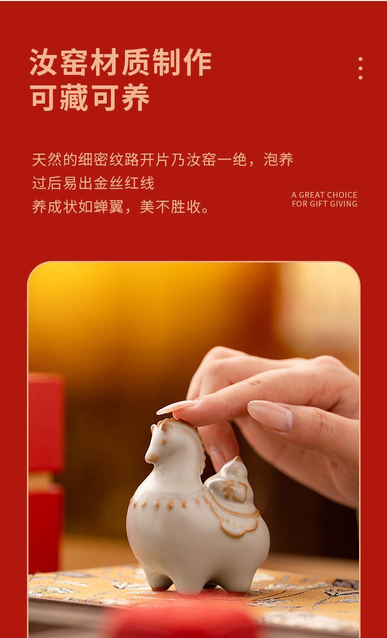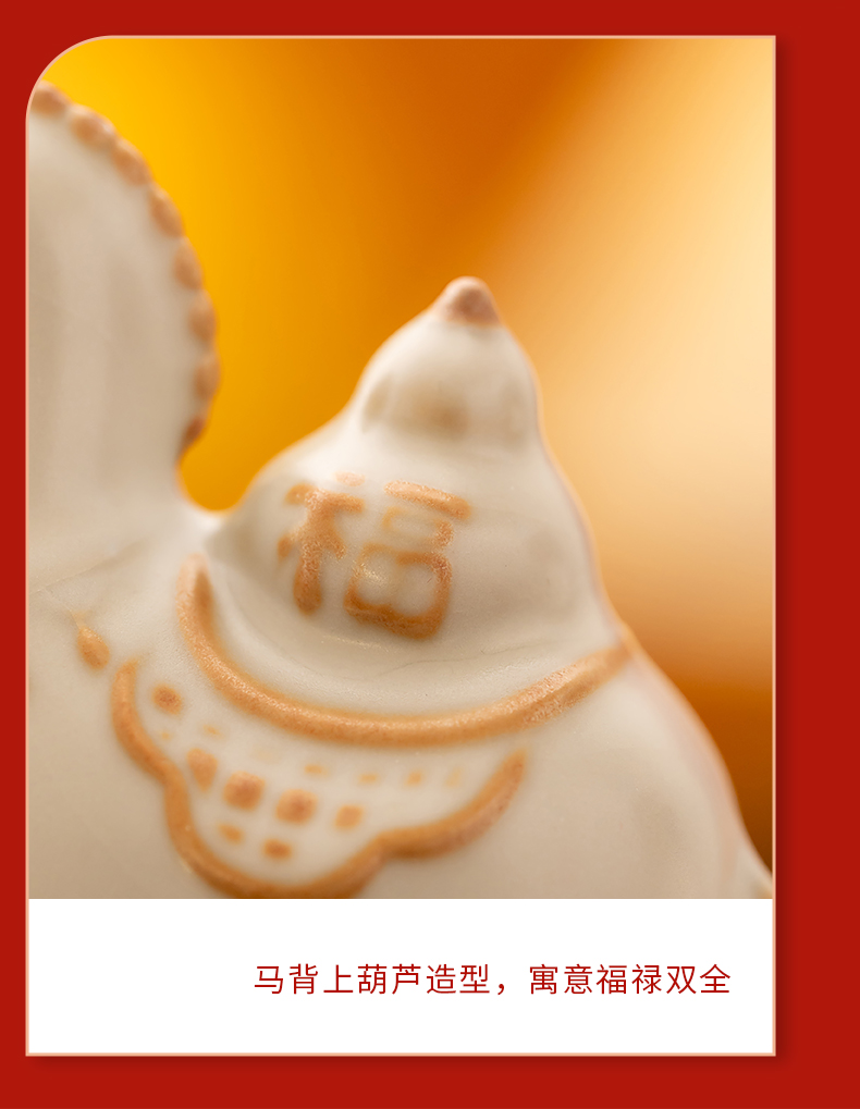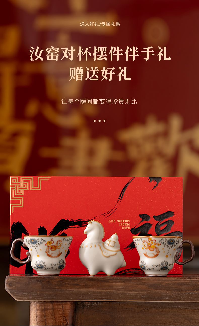 配 制:2杯 1摆件 1礼盒 手提袋 材质:汝黄瓷 规格:杯子 6*9cm 碟子直径9.3cm高1.8cm 摆件9.3*7cm 容量:70ml 推荐说明:马上有钱,马到成功杯子摆件套装,马背上葫芦造型,寓意福禄。亚黄汝瓷,玛瑙入釉,蝉翼开片,家有千财万贯,不如汝窑一片。技术新品。画面堆料技术,富有立体浮雕质感,真实感强。杯身开片,可养瓷。