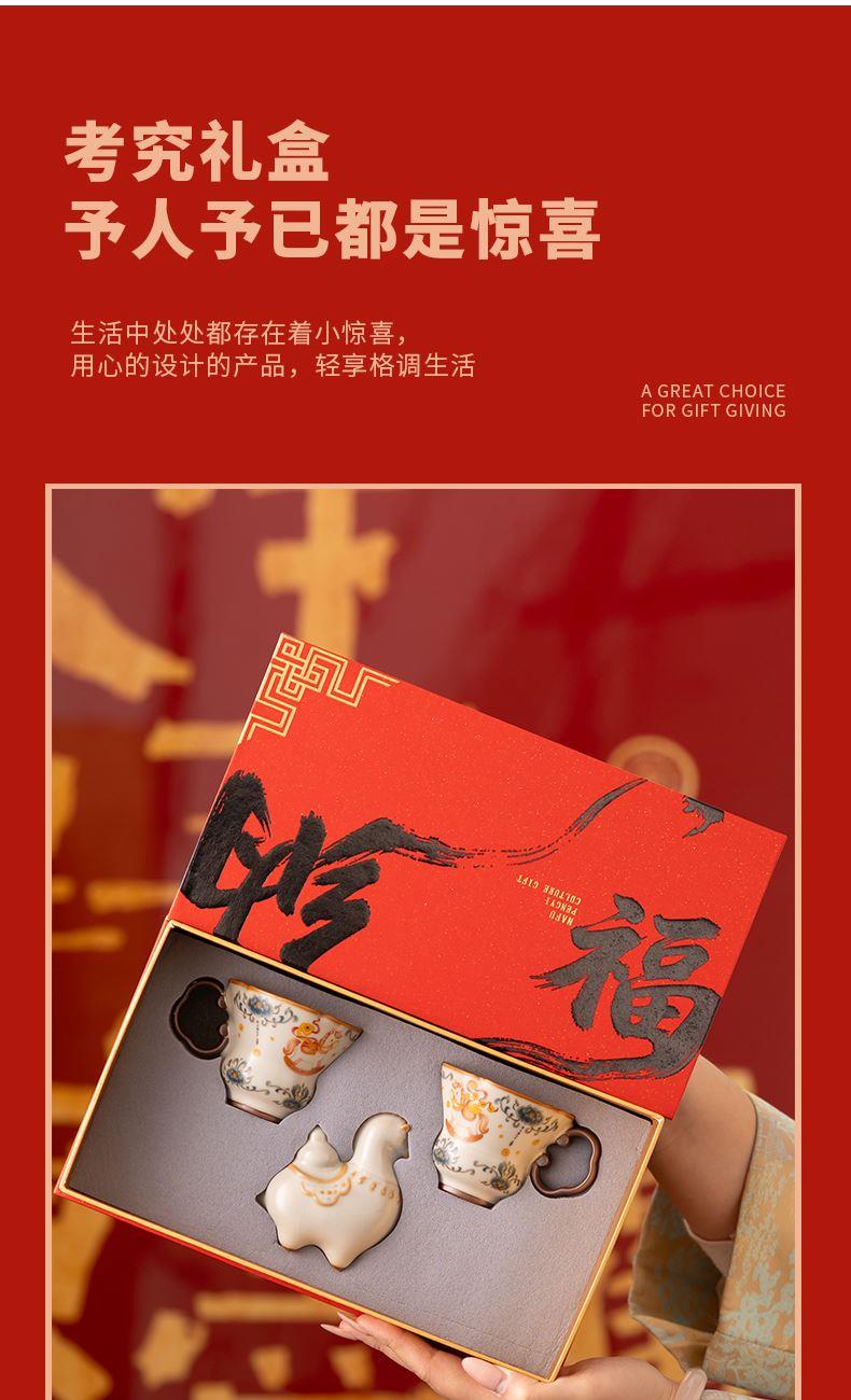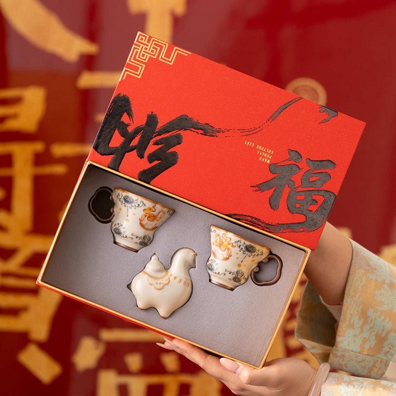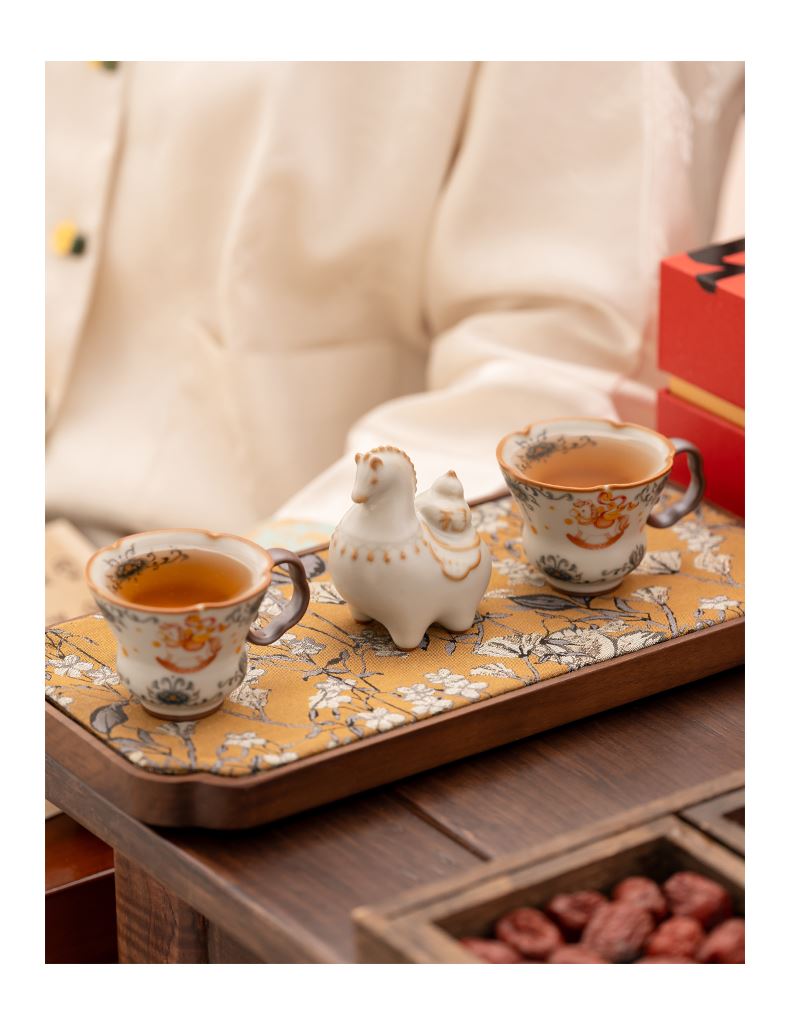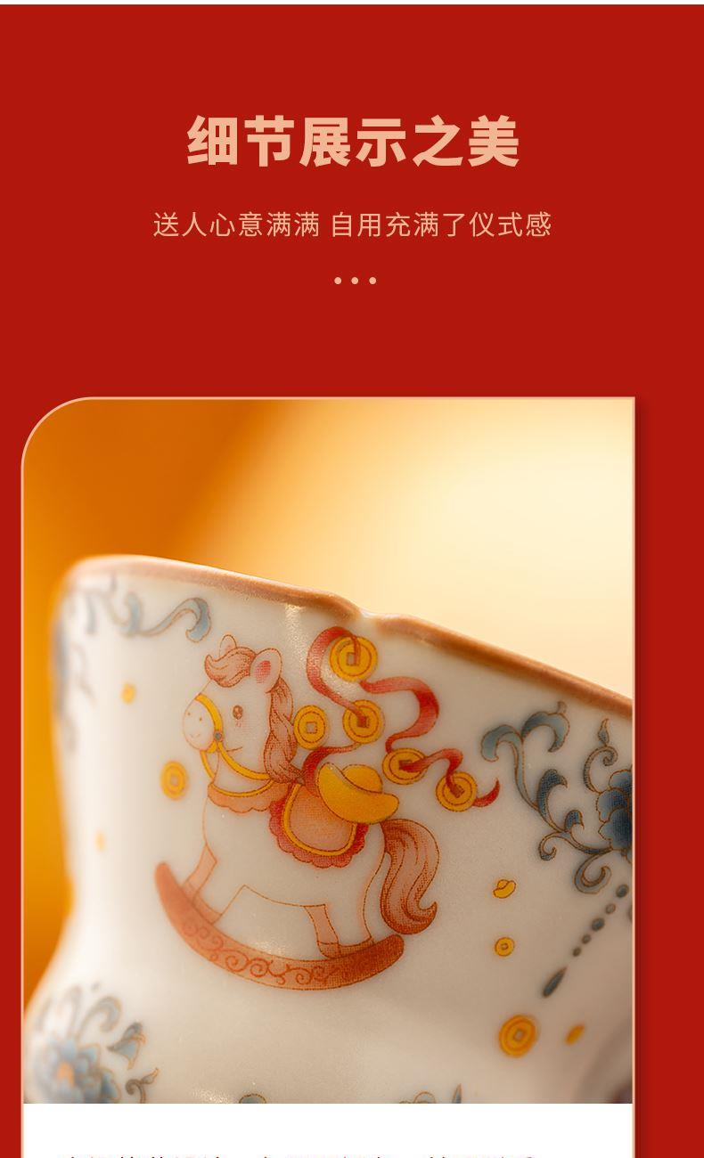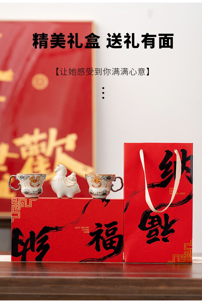 配 制:2杯 1摆件 1礼盒 手提袋 材质:汝黄瓷 规格:杯子 6*9cm 碟子直径9.3cm高1.8cm 摆件9.3*7cm 容量:70ml 推荐说明:马上有钱,马到成功杯子摆件套装,马背上葫芦造型,寓意福禄。亚黄汝瓷,玛瑙入釉,蝉翼开片,家有千财万贯,不如汝窑一片。技术新品。画面堆料技术,富有立体浮雕质感,真实感强。杯身开片,可养瓷。