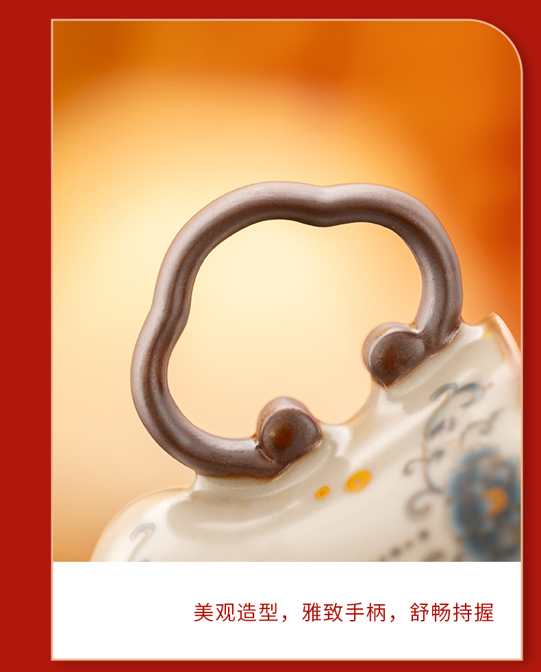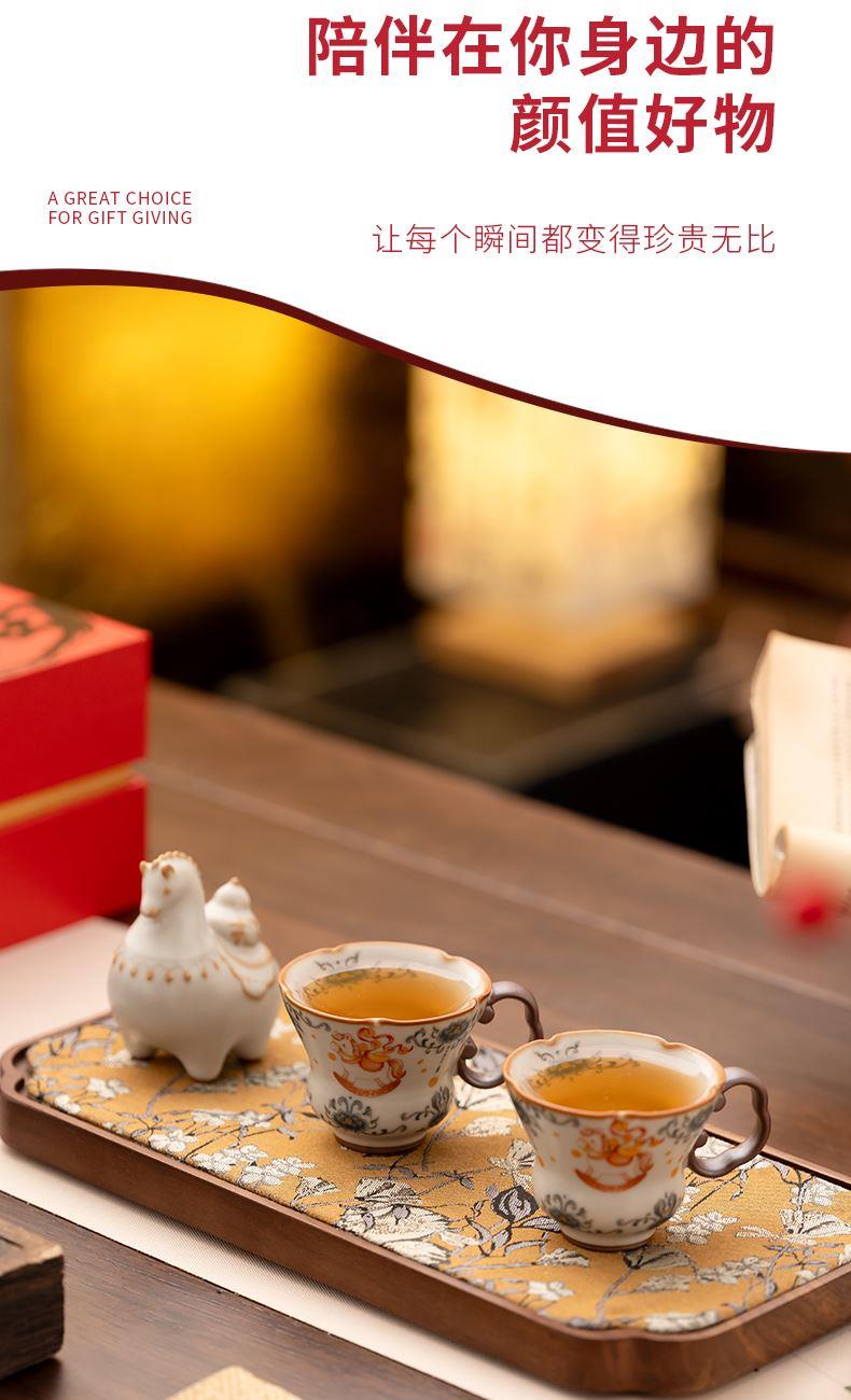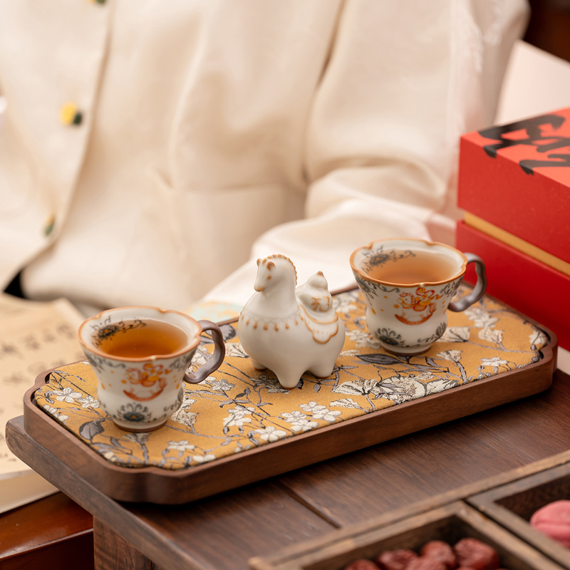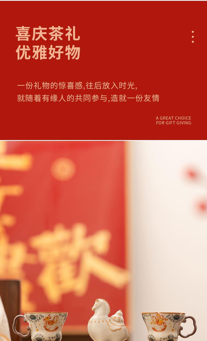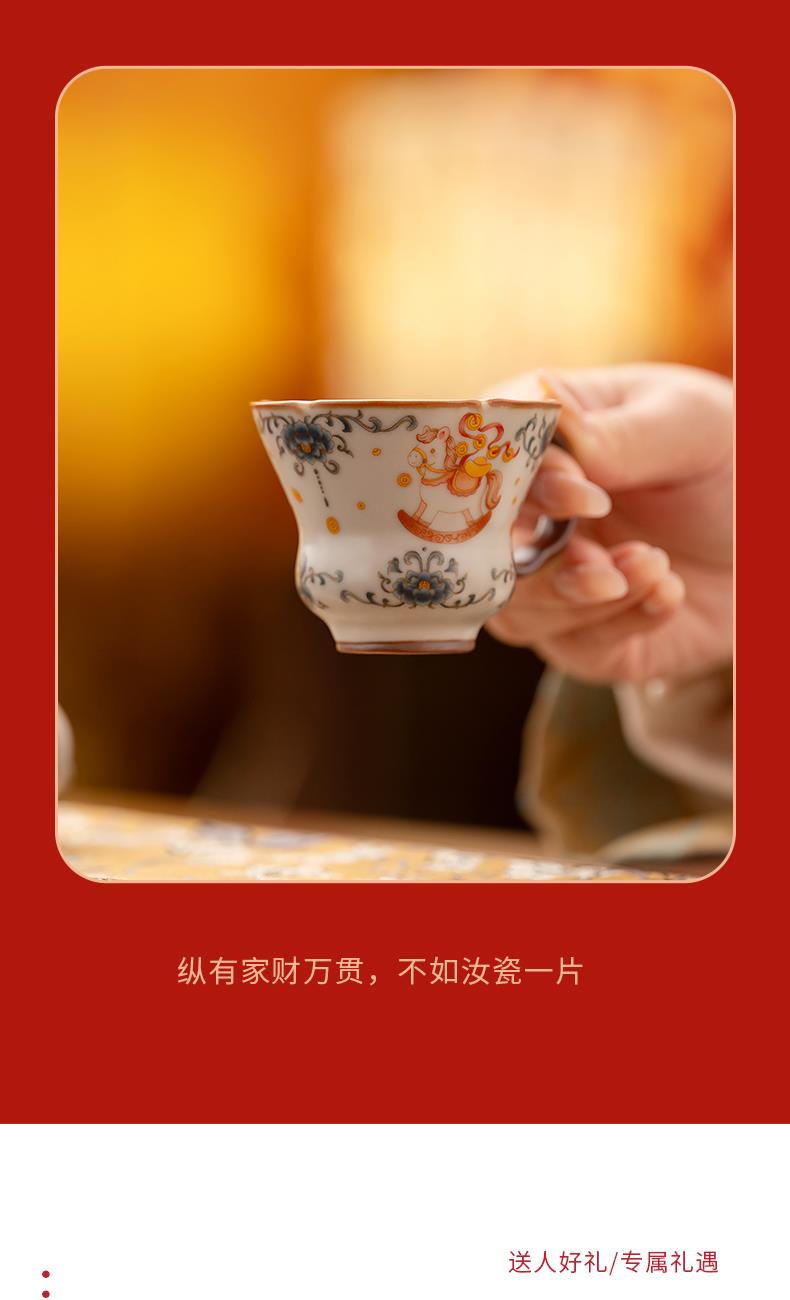 配 制:2杯 1摆件 1礼盒 手提袋 材质:汝黄瓷 规格:杯子 6*9cm 碟子直径9.3cm高1.8cm 摆件9.3*7cm 容量:70ml 推荐说明:马上有钱,马到成功杯子摆件套装,马背上葫芦造型,寓意福禄。亚黄汝瓷,玛瑙入釉,蝉翼开片,家有千财万贯,不如汝窑一片。技术新品。画面堆料技术,富有立体浮雕质感,真实感强。杯身开片,可养瓷。